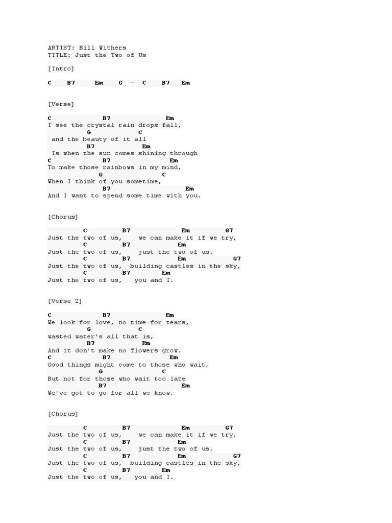 Just the two of us Just the two of us. Verse 2 We were seventeen when we fell just the two of us. Just the two of us Just the two of us Building castles in the sky Just the two of us You and I We look for love no time for tears Wasted waters all that is And it dont make no flowers grow Good things might come to those who wait Not for those who wait too late We gotta go for all we know Just the two of us We can make it if we try Just the two of us Just the two of us Just the two of us.
